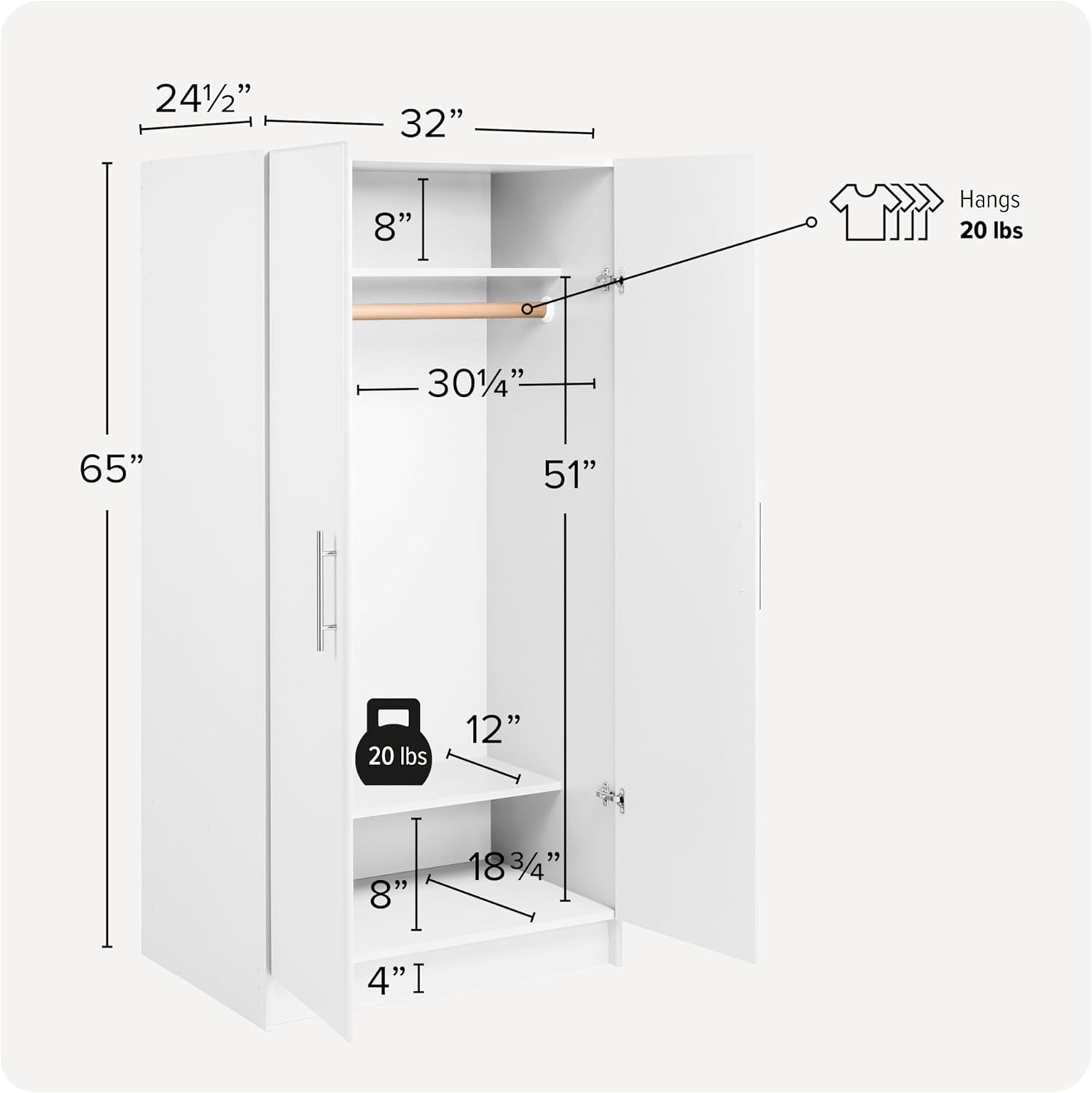 The Prepac Armoir Elite Wardrobe Closet & Cabinet is the perfect solution for organizing your clothes and accessories in style. This sleek and modern armoire features a spacious interior with a hanging rail for easy storage of your garments. The white finish adds a clean and fresh look to any room, while the compact size fits easily into any space. The durable construction ensures long-lasting use, making it a practical and functional addition to your home. Say goodbye to clutter and hello to a beautifully organized wardrobe with the Prepac Armoir Elite Wardrobe Closet & Cabinet.